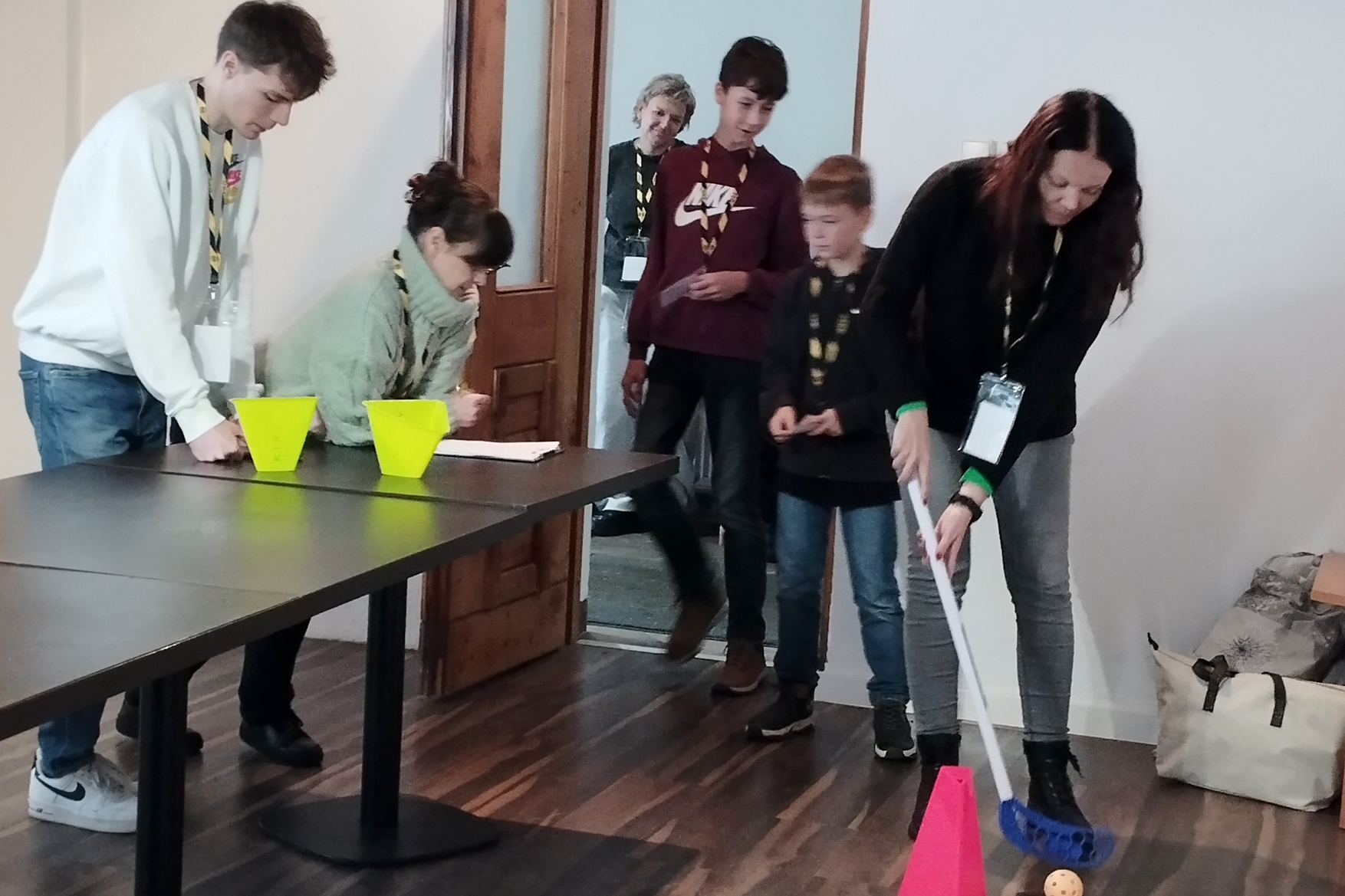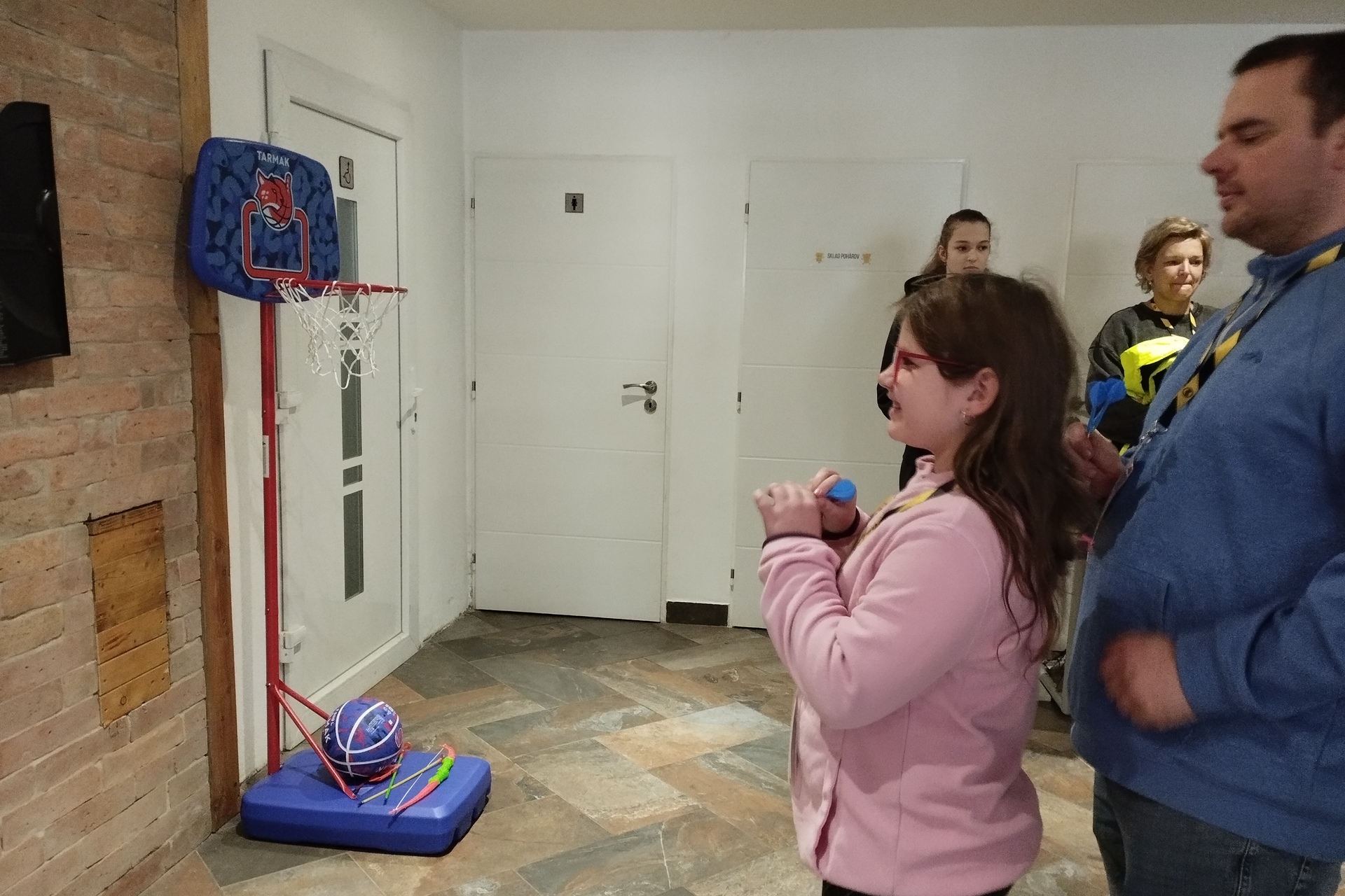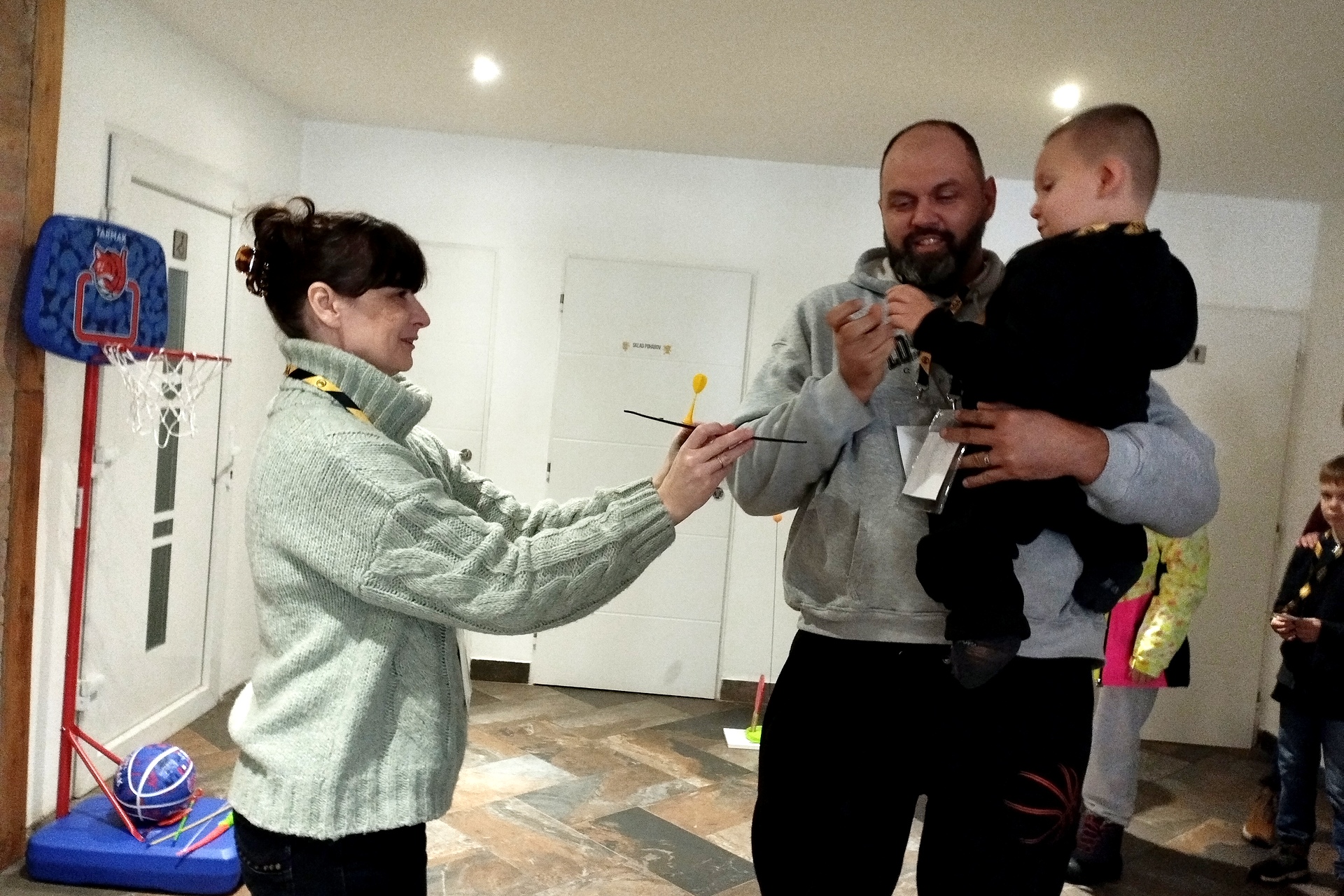 In the morning, we had sports activities that we originally planned to organize on the field. But – we invented ourselves and organized competitions for adults and children in the interior of the cottage. We threw darts, hit the ball into the basketball hoop, kicked the goal and also competed in slalom with a floorball stick and a ball on a track marked out by cones. Everyone was involved in the sports competition. We had an excellent organizer, Martin Tvrdoň, who was charmed by his mother Slávka.