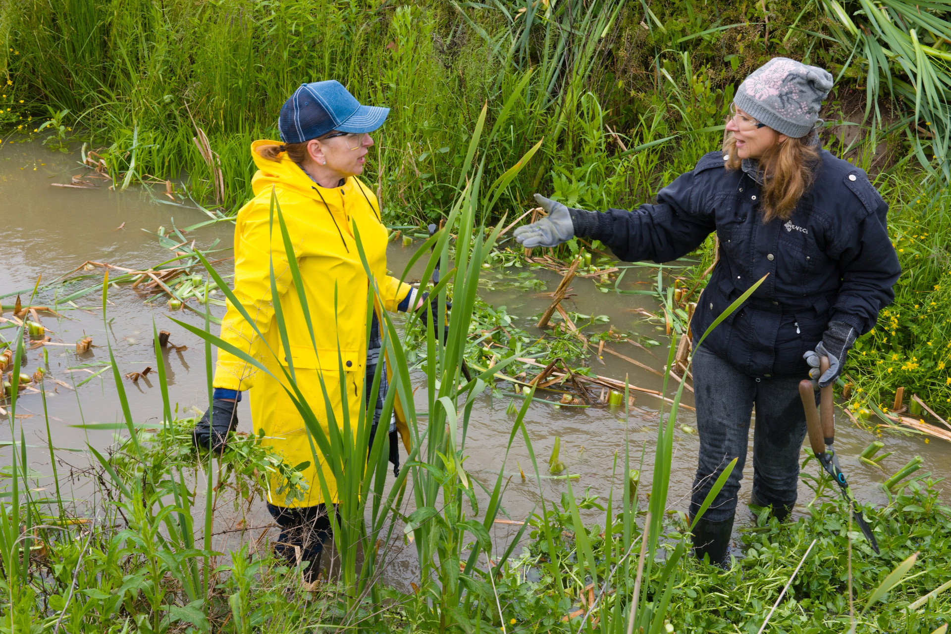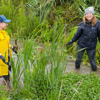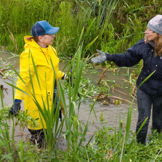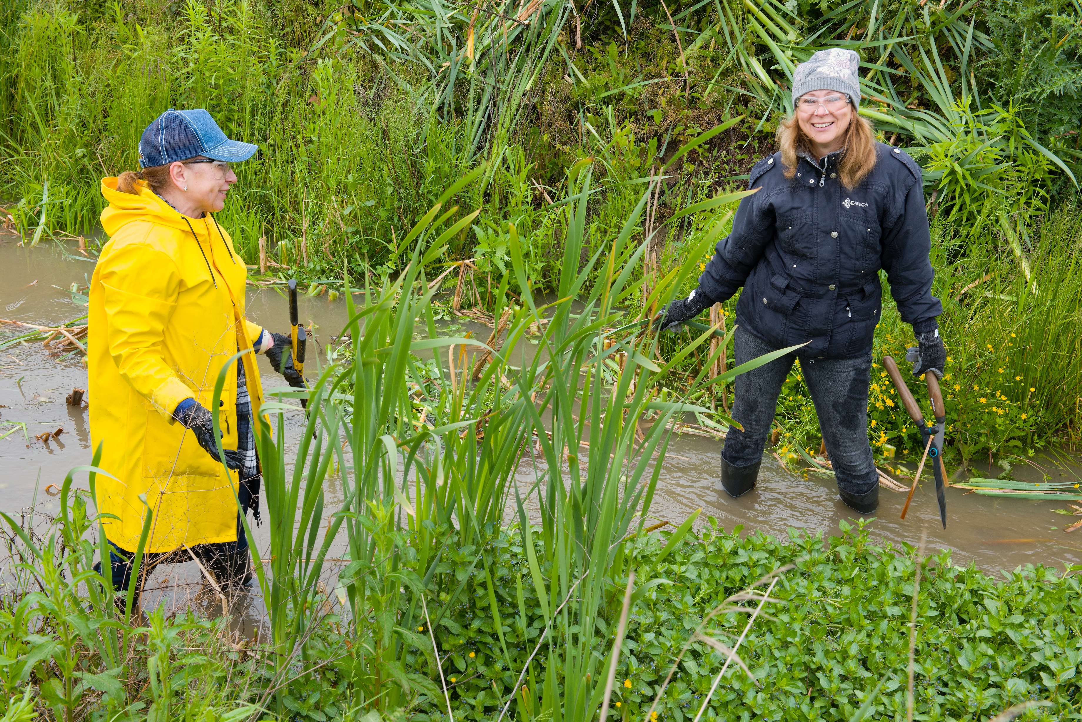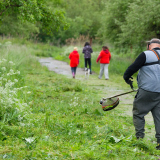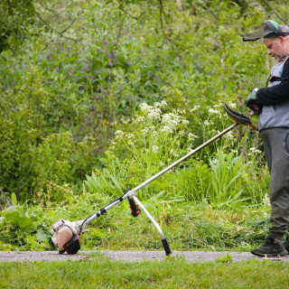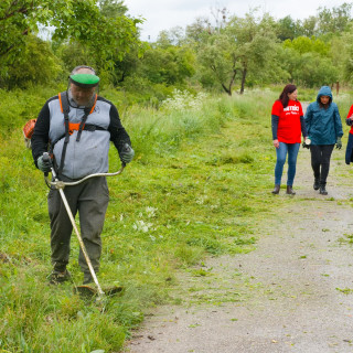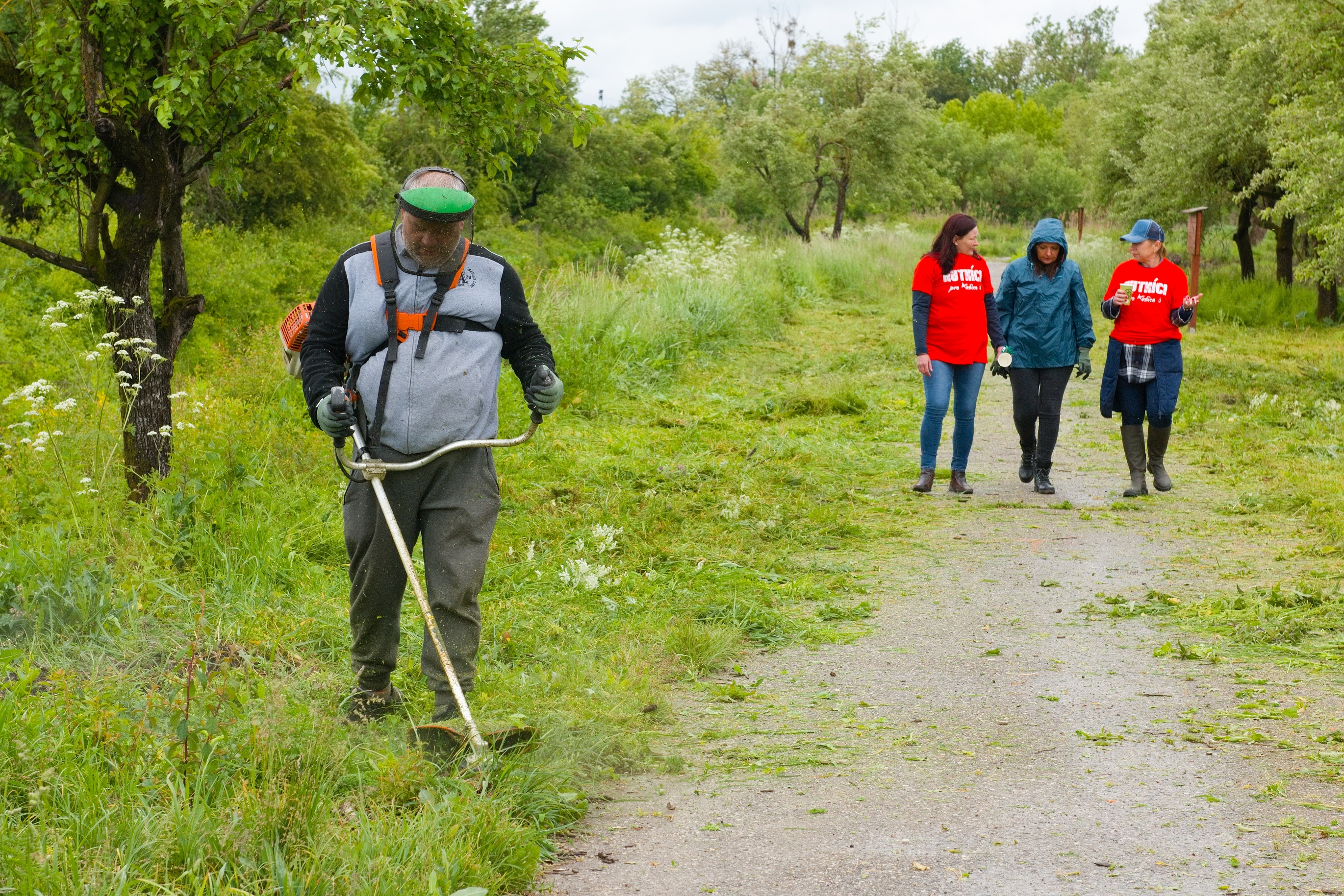 After the weather stabilized, when the rain stopped, Robert Rick, the shift foreman of the pipe expedition, began his work, mowing. He skillfully mowed the grass and overgrown greenery on the bank of the stream. His wife Andrea and twelve-year-old daughter Miriamka, who walked the dogs, also came to the volunteer day.