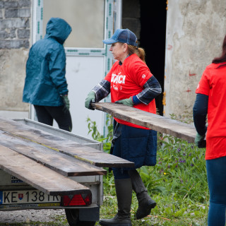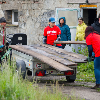 Due to the rainy weather, the traditional women's activity, painting in the exteriors of the shelter, was canceled. However, women's help was needed in trimming the overgrown bushes. Mária Župčanová, General Manager for Credit and Banking, Mária Ferčáková, Transport Officer, Jana Ciburová, Chief Credit Analysis Analyst, Liliana Hadžegová, Credit Analysis Economist, Laura Tomašovičová, Management Associate, and her friend Martin, who cut the tallest twigs, were skillfully illuminated with a horticultural pruning.