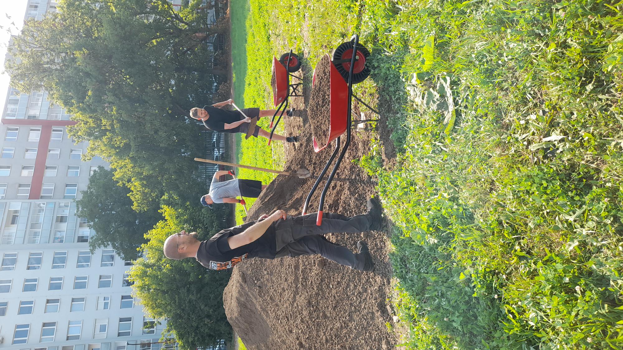 "We started revitalizing the athletic oval, football field, and jumping field at the end of May. We rented machinery that cleared overgrown areas and removed waste. We were pleasantly surprised when the clay surface appeared. We repaired the jumping field, laid non-woven geotextile to prevent sand from being absorbed during rain, and also laid nets against moles. In June, we leveled the football field with arable land. The football goals received new paint and new nets."