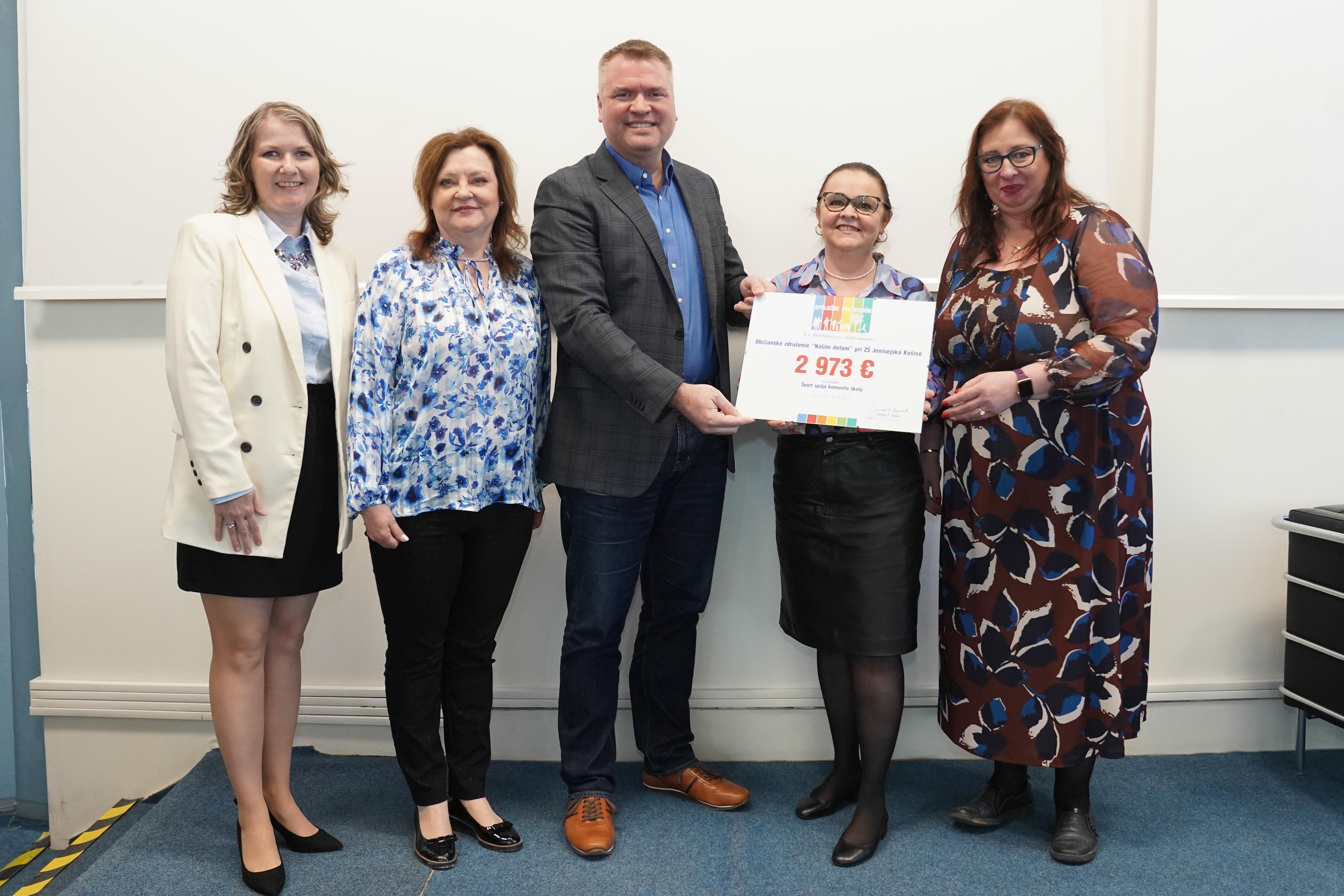 In the photo while handing over symbolic checks as part of the grant program Together for the Region: Jana Nováková, Renáta Miklošová from civic assosiation, Deputy President of USSK Mike Piekut, Miroslava Heželová from civic assosiation and director of elementary school Lucia Grünwaldová.