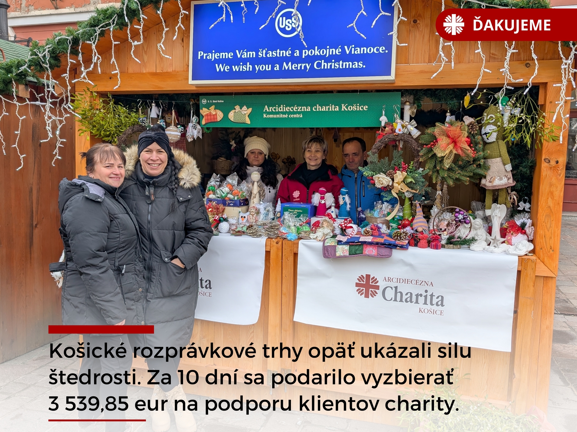 Košické rozprávkové trhy opäť ukázali silu ľudskej štedrosti a spolupatričnosti. Arcidiecézna charita Košice mala príležitosť prezentovať svoju činnosť a ručne vyrábané výrobky v charitatívnom stánku U. S. Steel Košice. Počas desiatich nezabudnuteľných dní, od 1. do 10. decembra 2024, vyzbierala nádherných 3 539,85 eur, ktoré budú využité na podporu klientov v jej zariadeniach.