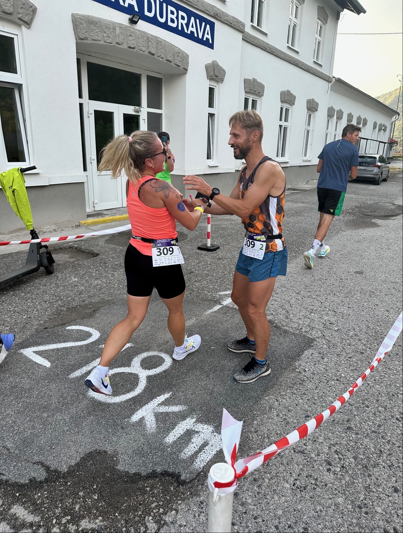 Katka: Do pretekov sa prihlasujú 6, 9 a a 12-členné tímy. My sme sa prihlásili ako 6-členný tím v kategórii ULTRA. Každý z nás odbehol 6 úsekov, teda približne 60 km. Z nášho podniku sme v štafete boli len my dvaja. Slavo a kamarátka Maťka mali ako jediní z tímu skúsenosti so 6-člennou štafetou. My ostatní sme už v minulosti bežali v 12-člennom tíme. 6-členné družstvo má výhodu v tom, že svaly tak nestuhnú. Každý z tímu beží približne každých 4 až 5 hodín, pauzy nie sú príliš dlhé. Slavo si nás doberal, vraj len počkajte na ten piaty úsek, ten bude kritický. Ale zvládli sme to, i keď posledné úseky boli náročné, pretože bolo veľmi horúco, 34°C.