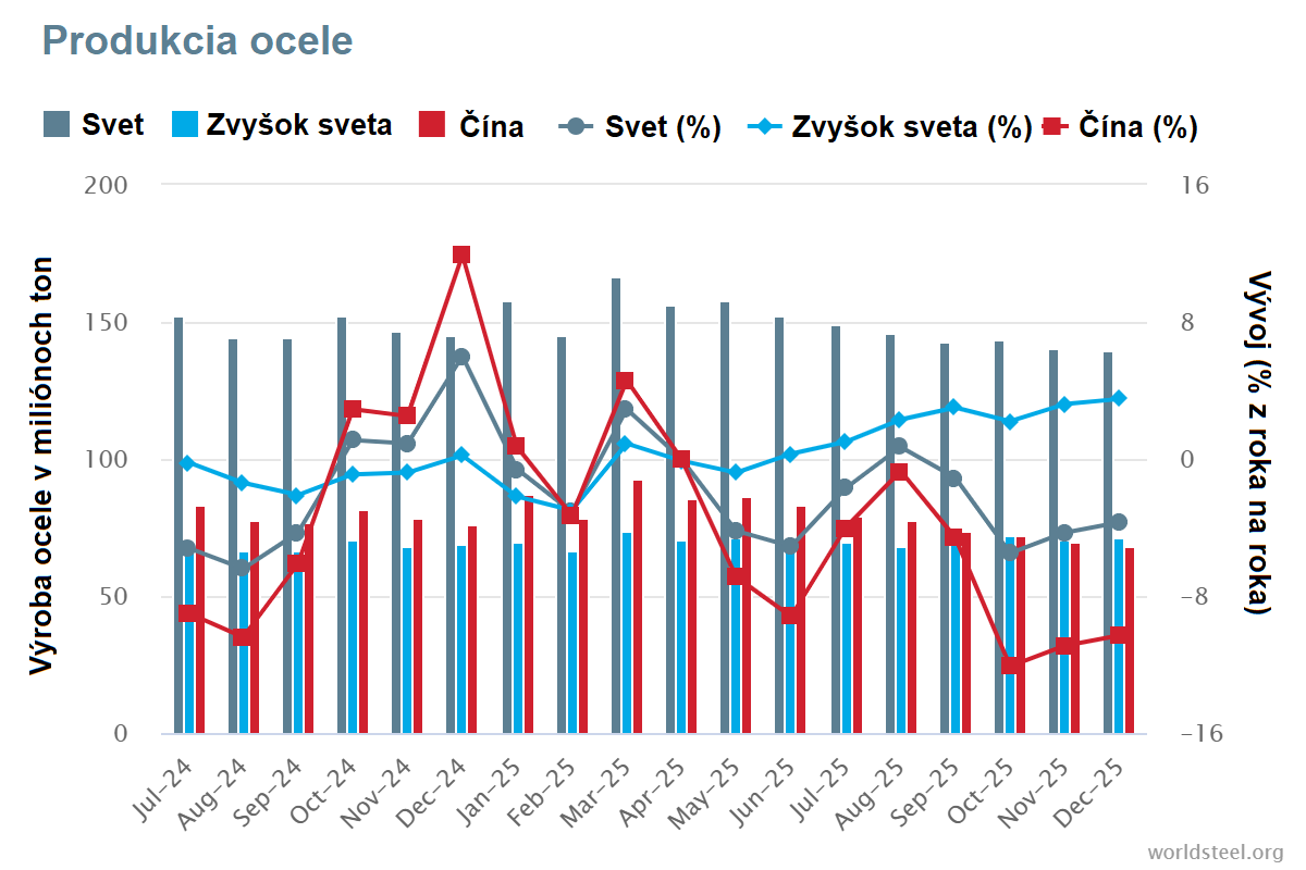 Svetová produkcia ocele 70 krajín spolupracujúcich so svetovou oceliarskou asociáciou The World Steel Association (worldsteel) v decembri 2025 dosahla 139,6 milióna ton, čo predstavuje pokles o 3,7 % v porovnaní s decembrom 2024.