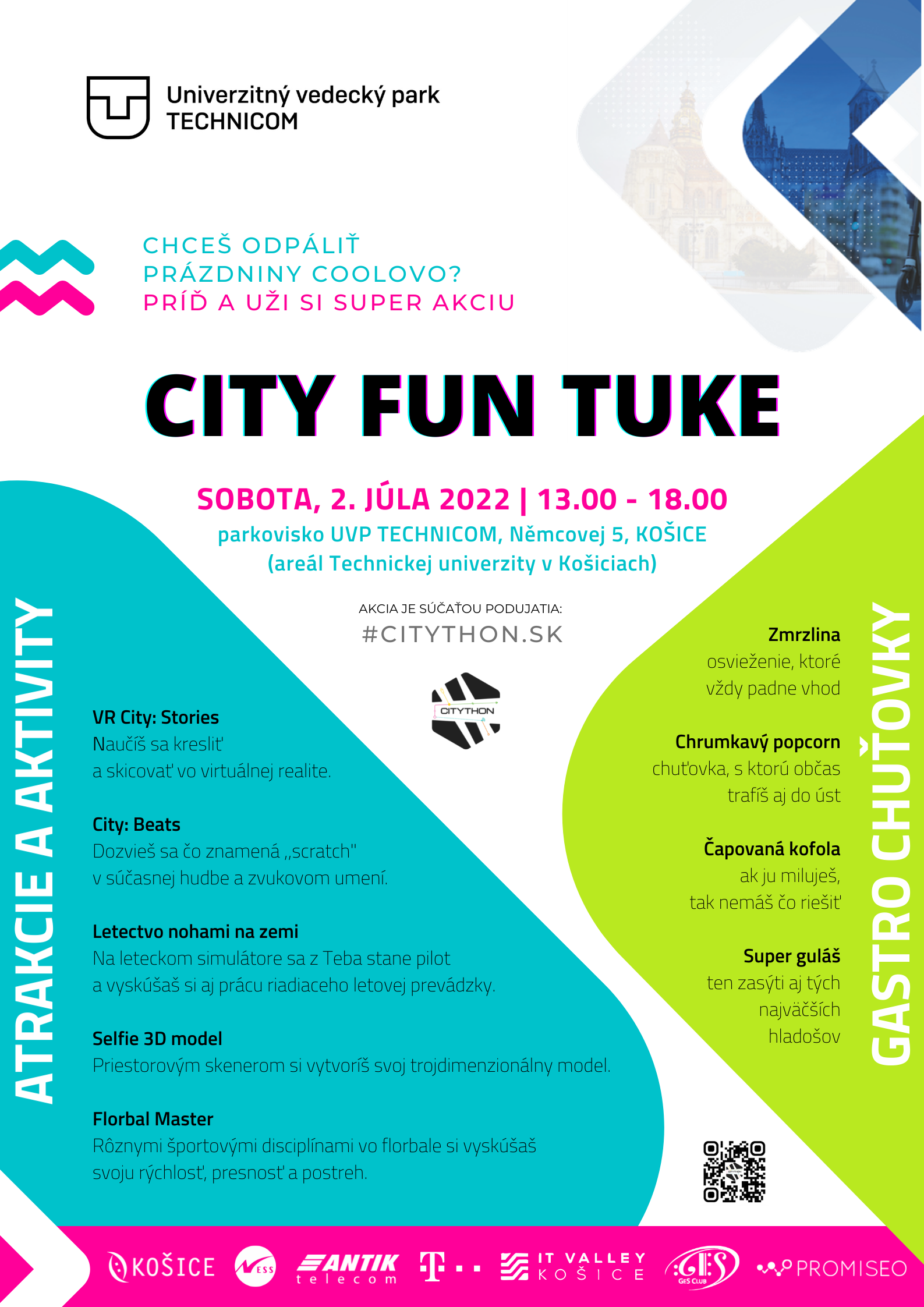 Pozývame zamestnancov U. S. Steel Košice na sprievodnú akciu v rámci Citythonu CITY FUN TUKE, ktorá sa bude konať 2. 7. 2022 v čase od 13.00 do 18.00 hod. na parkovisku pred Univerzitným vedeckým parkom (UVP TECHNICOM). Akcia je určená prioritne pre zamestnancov s detmi, ale určite bude zaujimava pre všetkých návštevníkov.