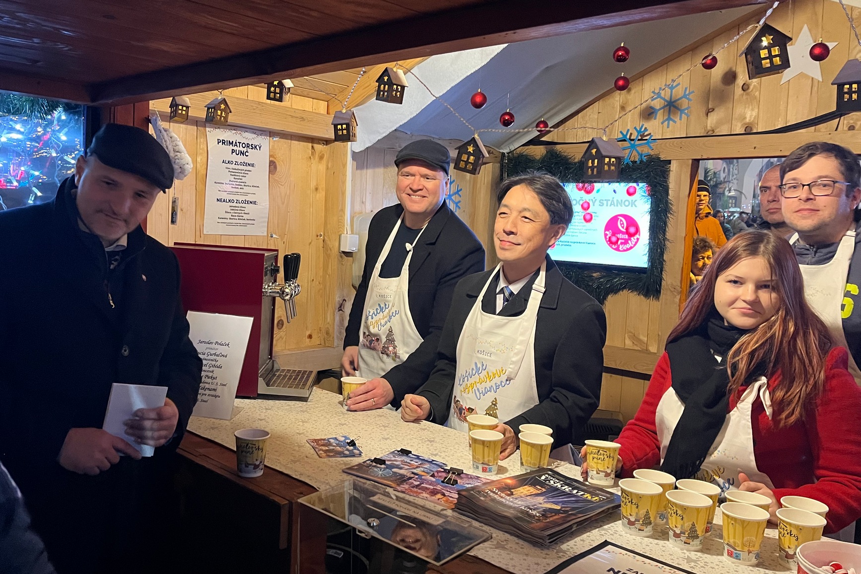 U. S. Steel Košice je už tradične hlavným partnerom Košických rozprávkových Vianoc. Po rozsvietení vianočného stromu a Hlavnej ulice, 1. decembra 2025, predávali preto chvíľu primátorský punč aj Mike Piekut a Isao Takenami.