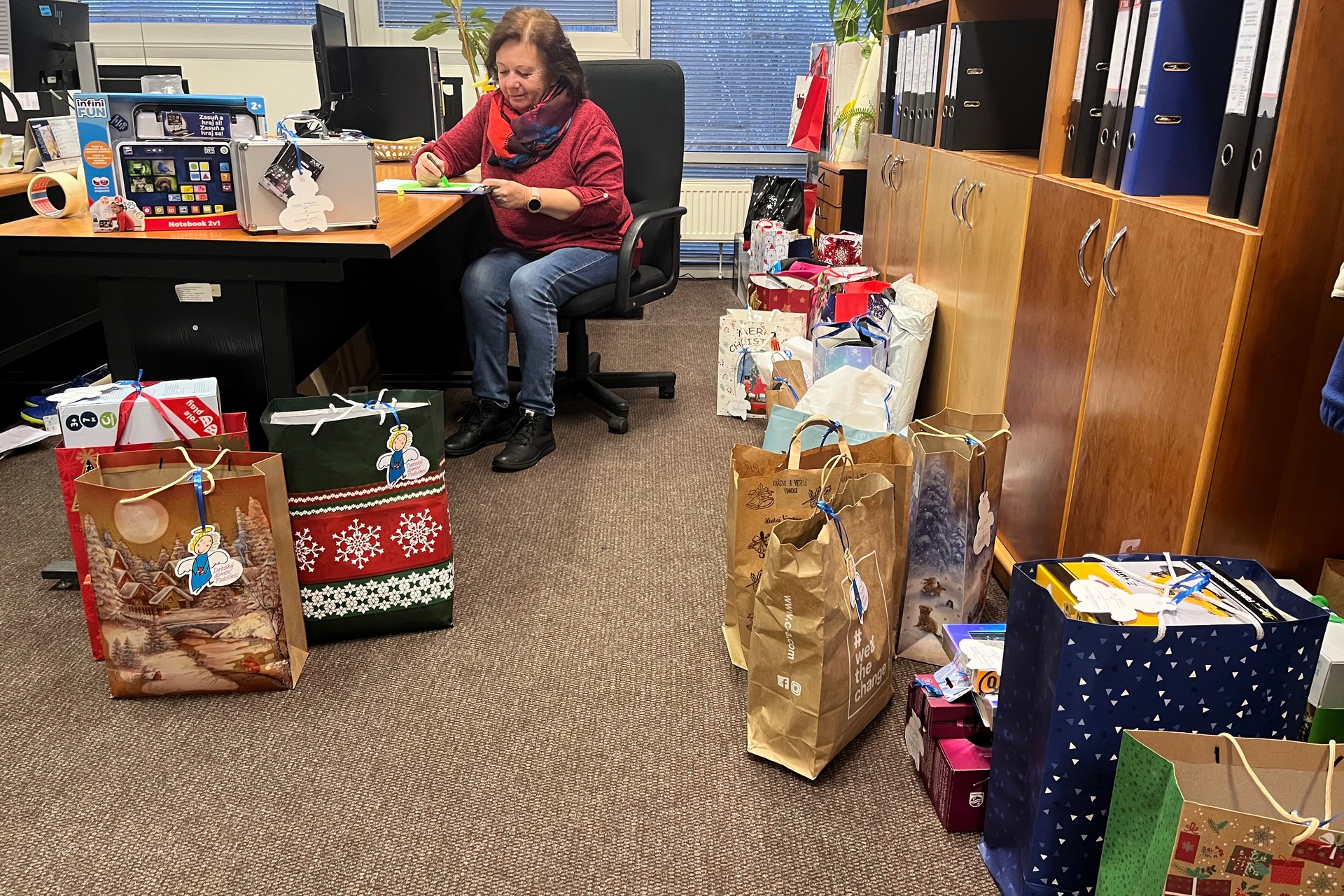 V uplynulých dňoch sa kancelária Slávky Tvrdoňovej z Vonkajších vzťahov postupne menila na veľký darčekový výklad, alebo Santovu dielňu. Dnes už sú takmer všetky darčeky doručené k nám. A je ich takmer 150! Malé, veľké, ľahké i ťažké – korčule, bábiky, kozmetika, kolieskové korčule, kolobežky, bezdrôtové slúchadlá, bundy, teplákové súpravy .... presne podľa želaní detí.