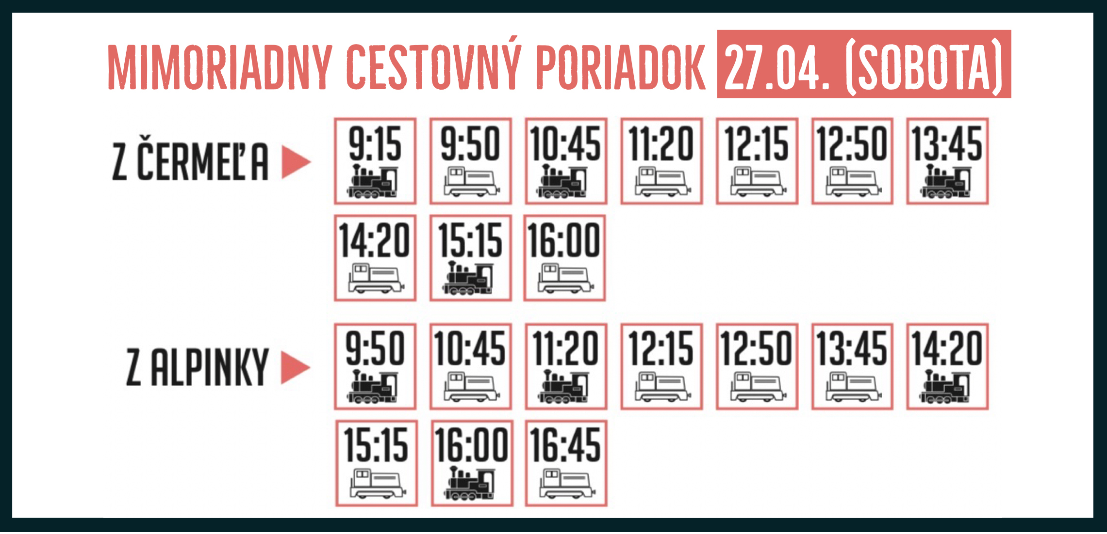 Priaznivci, fanúšikovia a priatelia Košickej detskej historickej železnice, dovoľte aby sme sa Vám poďakovali za Vašu podporu a zároveň Vás pozvali na SLÁVNOSTNÉ OTVORENIE KOŠICKEJ HISTORICKEJ ŽELEZNICE, ktoré sa uskutoční túto sobotu 27. apríla o 9:00 hod. v Čermeli.