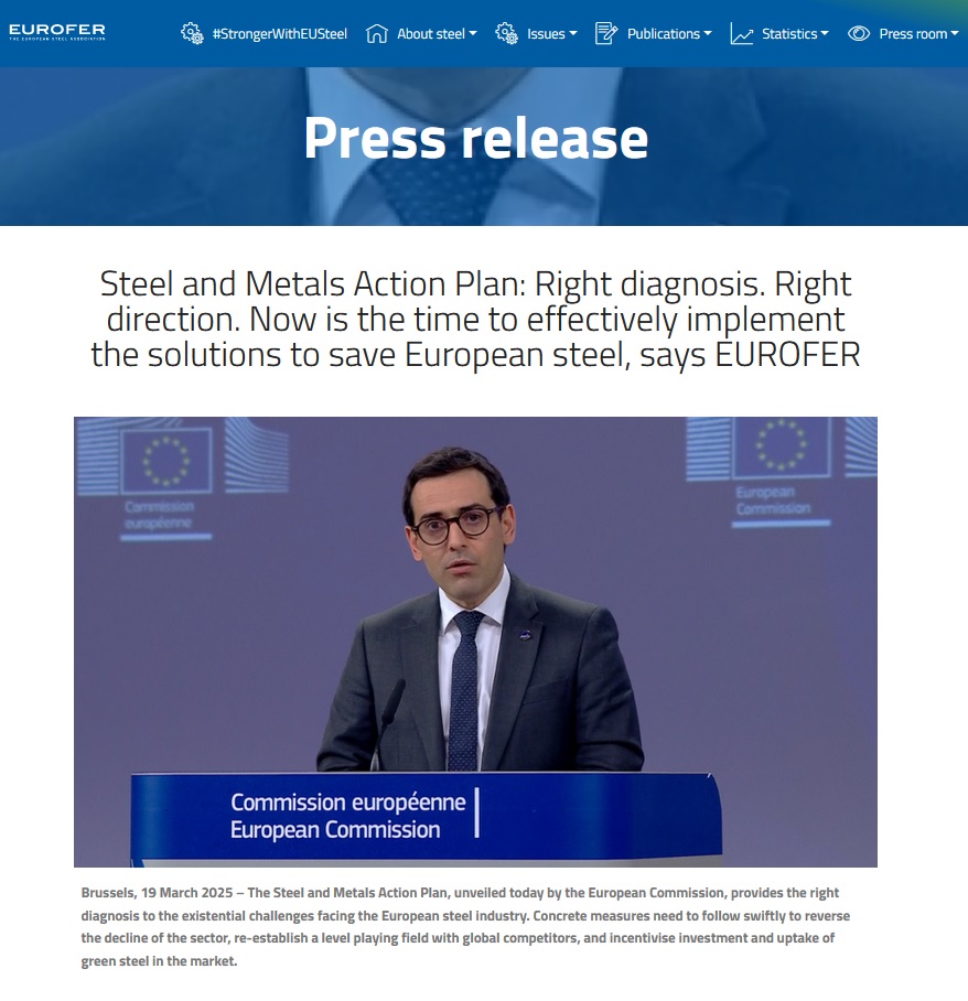 Akčný plán podporila i Európska oceliarska asociácia - EUROFER vo svojej včerajšej tlačovej správe: