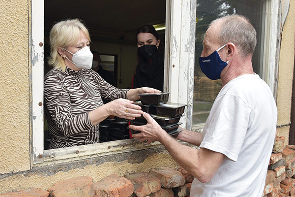 Charitný dom sv. Alžbety bol našou prvou zastávkou a odniesli sme tam 420 obedov – teda po tri obedy pre každého. Soňa Hlaváčová, vedúca sociálneho zariadenia, sa našej iniciatíve veľmi potešila: „Je to obrovská pomoc pre našich ľudí. My im zabezpečujeme 1 hustú polievku denne a sestry Vincentky chodia aj cez víkendy. Obedy od vás stačí iba ohriať, našťastie chladničky a mikrovlnky máme.“