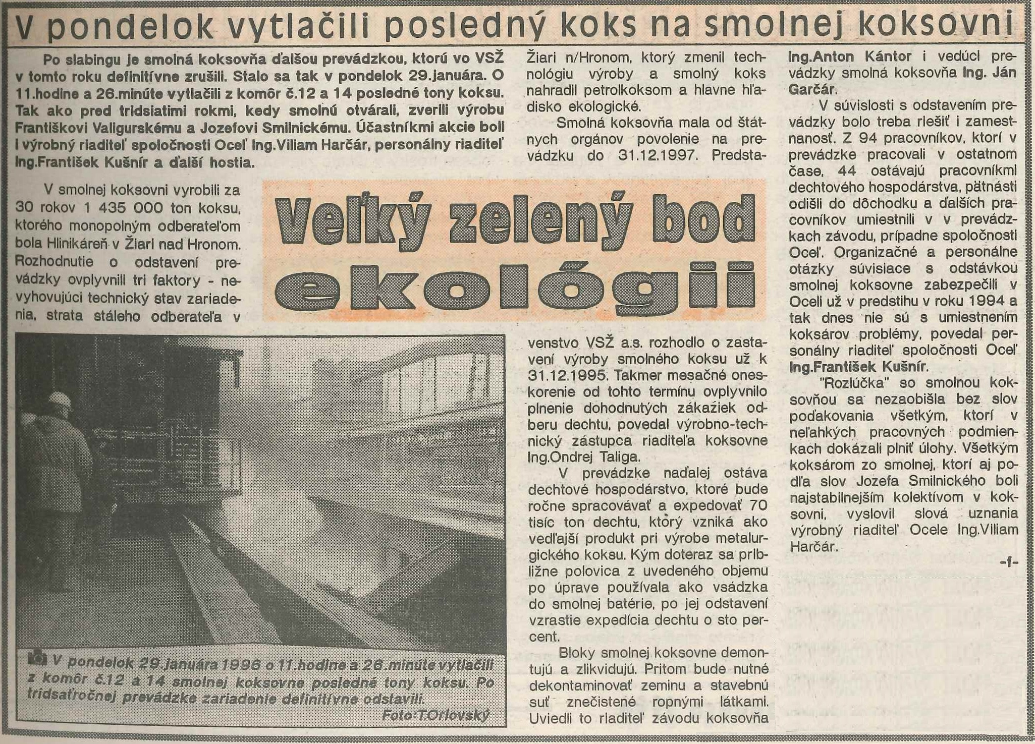 O devätnásť dní neskôr, 29. januára 1996, vytlačila zo svojich komôr č. 12 a 14 posledné tony koksu aj smolná koksovňa. Potom zariadenie, ktoré vyprodukovalo v svojej tridsaťročnej histórii 1 435 000 ton koksu najmä pre svojho najväčšieho odberateľa Hlinikáreň v Žiari nad Hronom, definitívne odstavili. Rozhodnutie o odstavení smolnej koksovne ovplyvnili tri faktory – nevyhovujúci technický stav zariadenia, strata stáleho odberateľa, ktorý zmenil technológiu výroby a smolný koks nahradil petrolkoksom a hlavne environmentálne hľadisko.