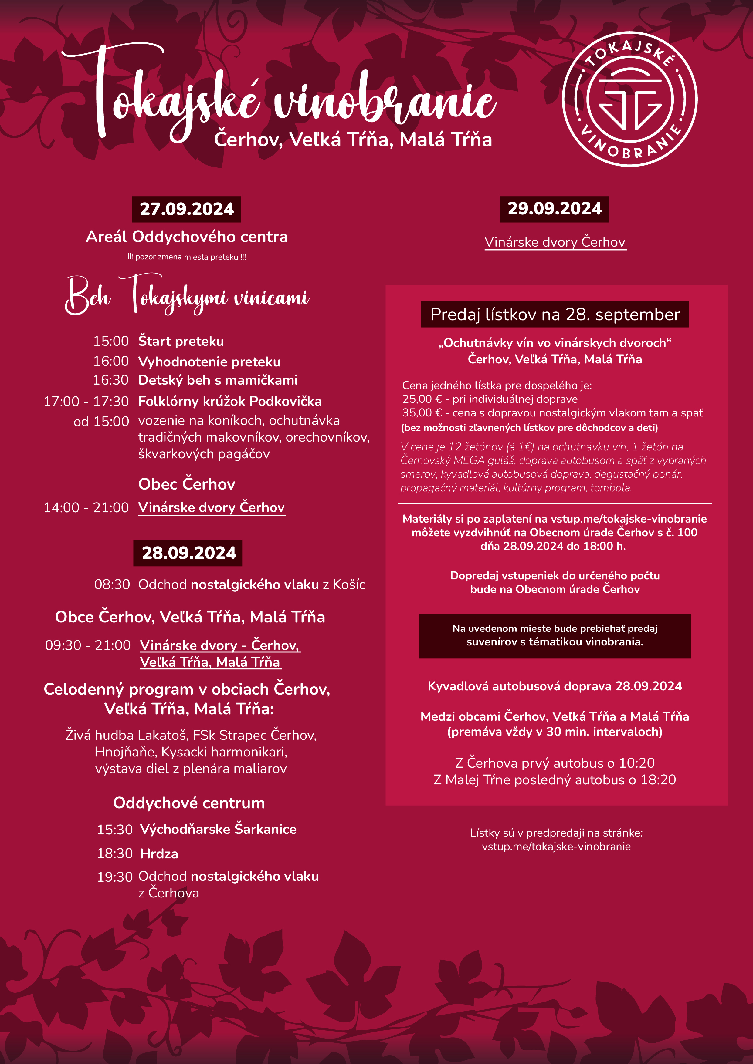 Ak ste nevyhrali a máte záujem o rodinný výlet na web stránke Tokajským expresom na Tokajské vinobranie 2024 si môžete kúpiť lístok na Tokajský express.