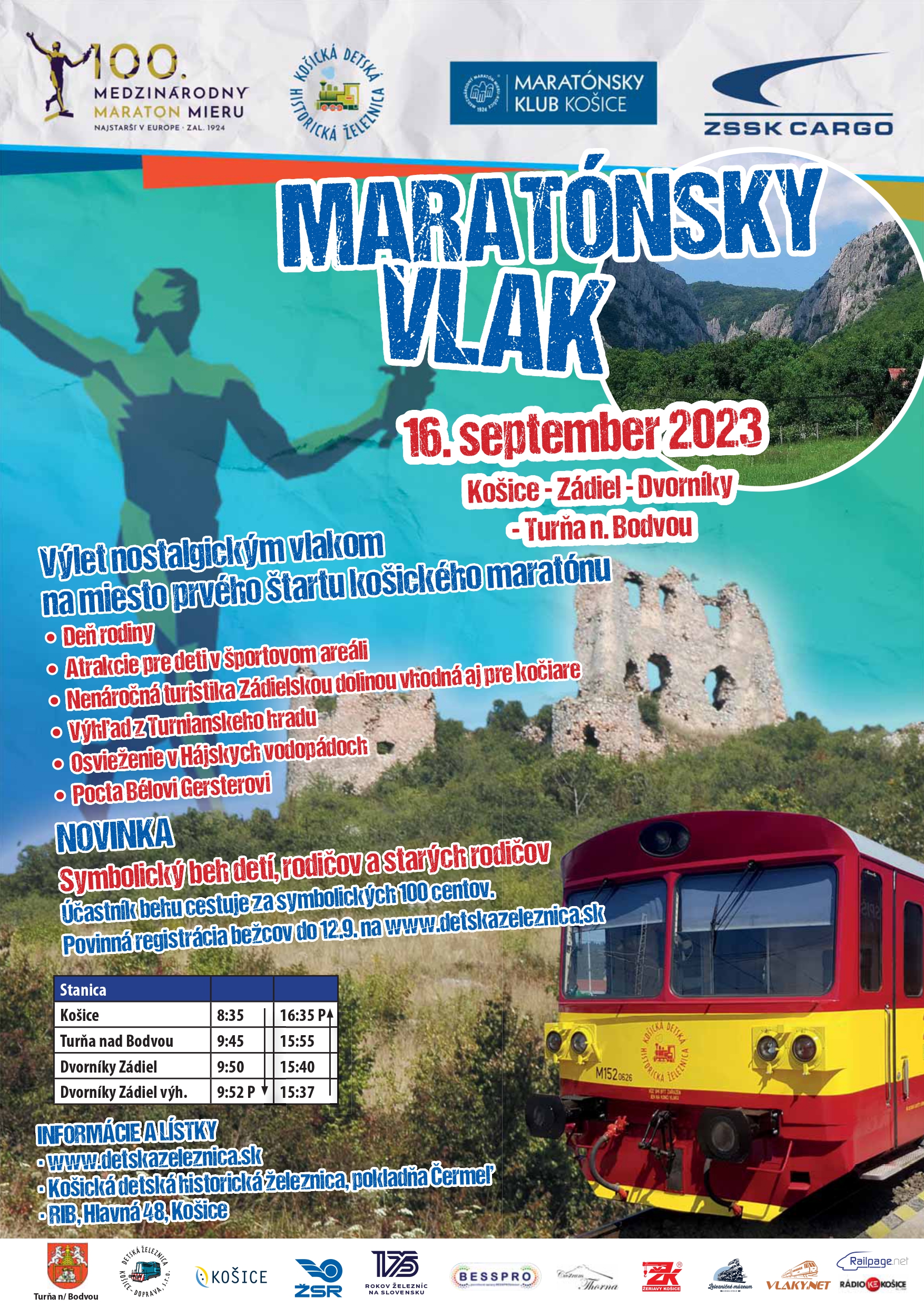 Vážení priaznivci Košickej detskej historickej železnice a Veľkých vlakových výletov, dovoľujeme si vás pozvať na jeden z našich najkrajších výletov - Maratónsky vlak do Turne n. Bodvou a Zádielu 16.9. o 8:35 z Hlavnej železničnej stanice v Košiciach.