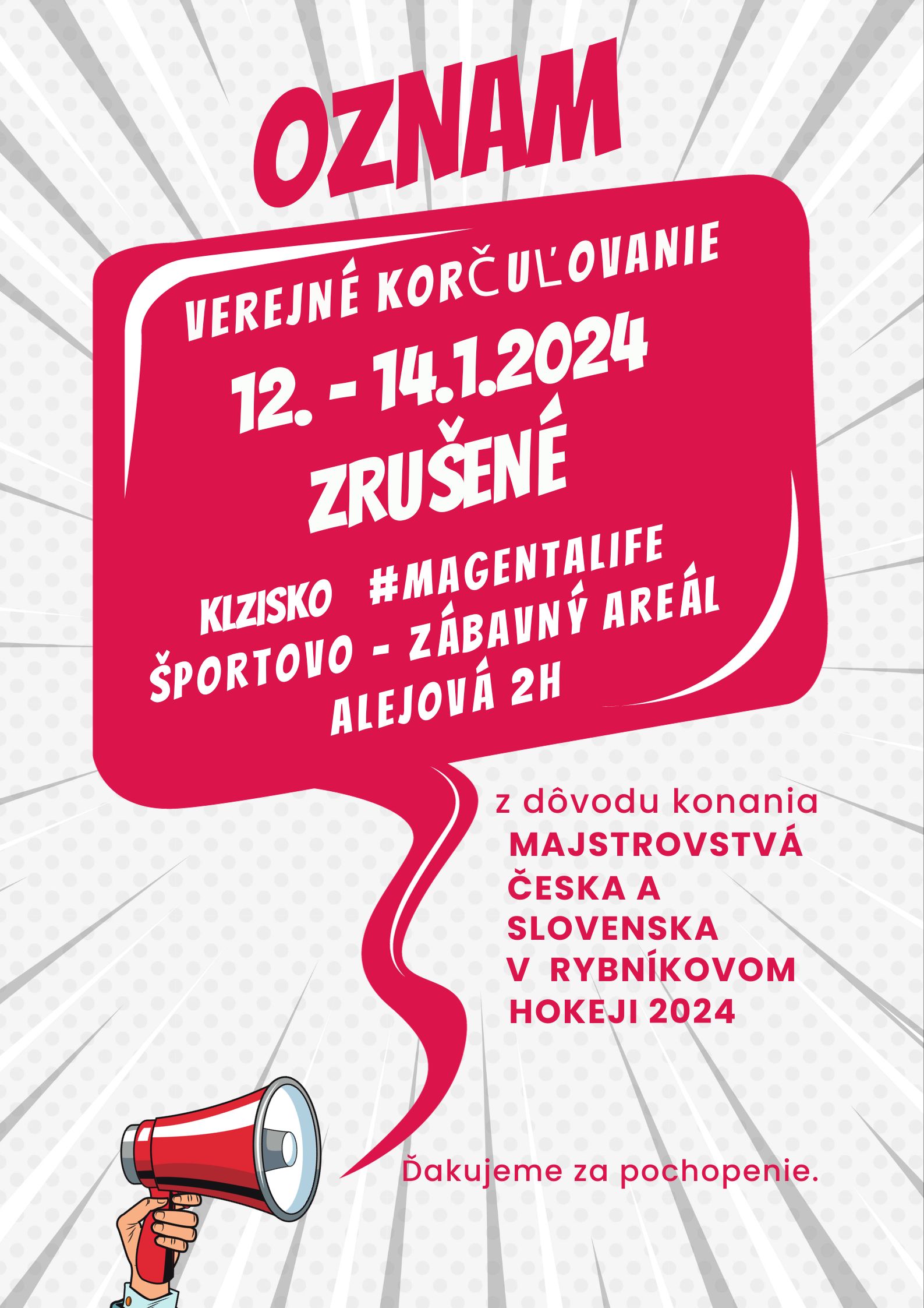 Kvôli tomuto podujatiu bude verejné korčuľovanie v dňoch 12. - 14.1.2024 zrušené.