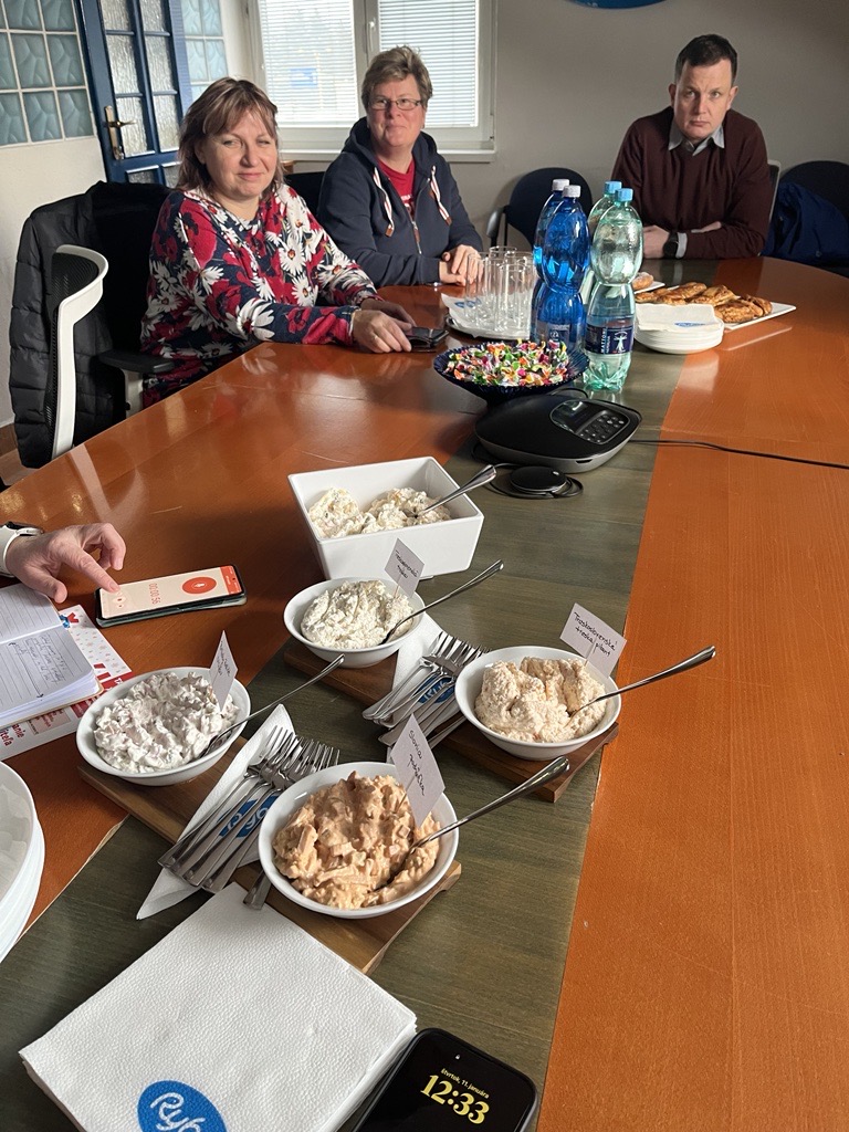 Na spoločnom stretnutí predstavil Michal Baluch všetky segmenty závodu a jeho produkty. Takmer 80 percent výroby tvoria šaláty, nasledujú marinované kyslé ryby, mrazené ryby, údená výroba a výroba majonézy, ktorú nájdeme v druhom polroku už aj na pultoch predajní. Dozvedeli sme sa, že pravidelne uvádzajú na trh rôzne nové druhy šalátov, skúšajú recepty, s ktorými prídu zamestnanci, predajcovia, či verejnosť. Tak napríklad do výroby vlani zaradili rybací šalát so slivkami. S týmto nápadom a receptom prišla jedna z majsteriek. Do ochutnávok a hodnotenia zapájajú aj študentov na internátoch a my sa už tešíme, že zapoja aj nás, železiarov. Budeme mať možnosť ochutnávať a hodnotiť nielen šaláty z produkcie závodu Ryba Košice, ale aj výrobky z ďalších závodov, ktoré tvoria portfólio spoločnosti TAURIS, a.s. Samozrejme, o termínoch vás budeme včas informovať.