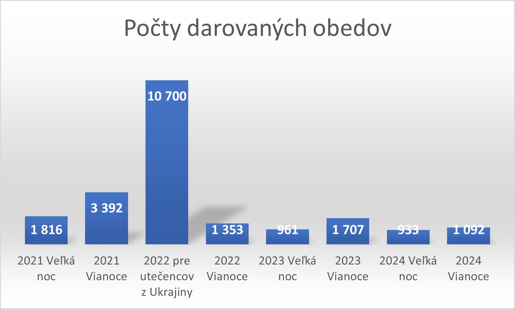 Už v roku 2021 sme rozbehli projekt Darujte obed. O obedy sme sa podelili s ľuďmi bez domova, pomohli aj matkám a deťom, ktoré našli svoj prechodný domov v krízovom centre v Košickej Novej Vsi a ľuďom, ktorí ušli pred vojnou z Ukrajiny.