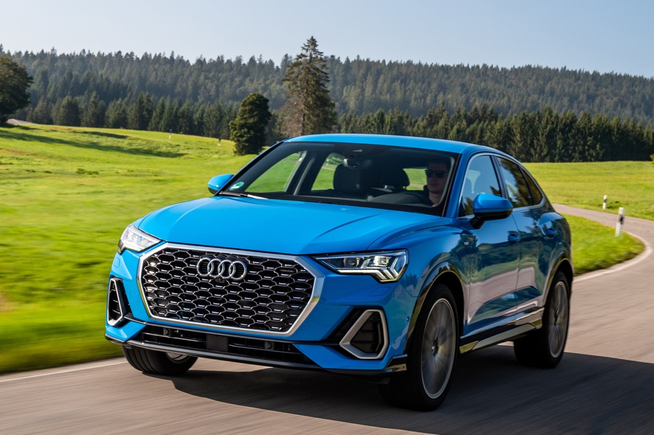 Je ňou Audi Q3 Sportback, vo výbave S-line, farba turbo blue, 2,0 liter mild hybrid.