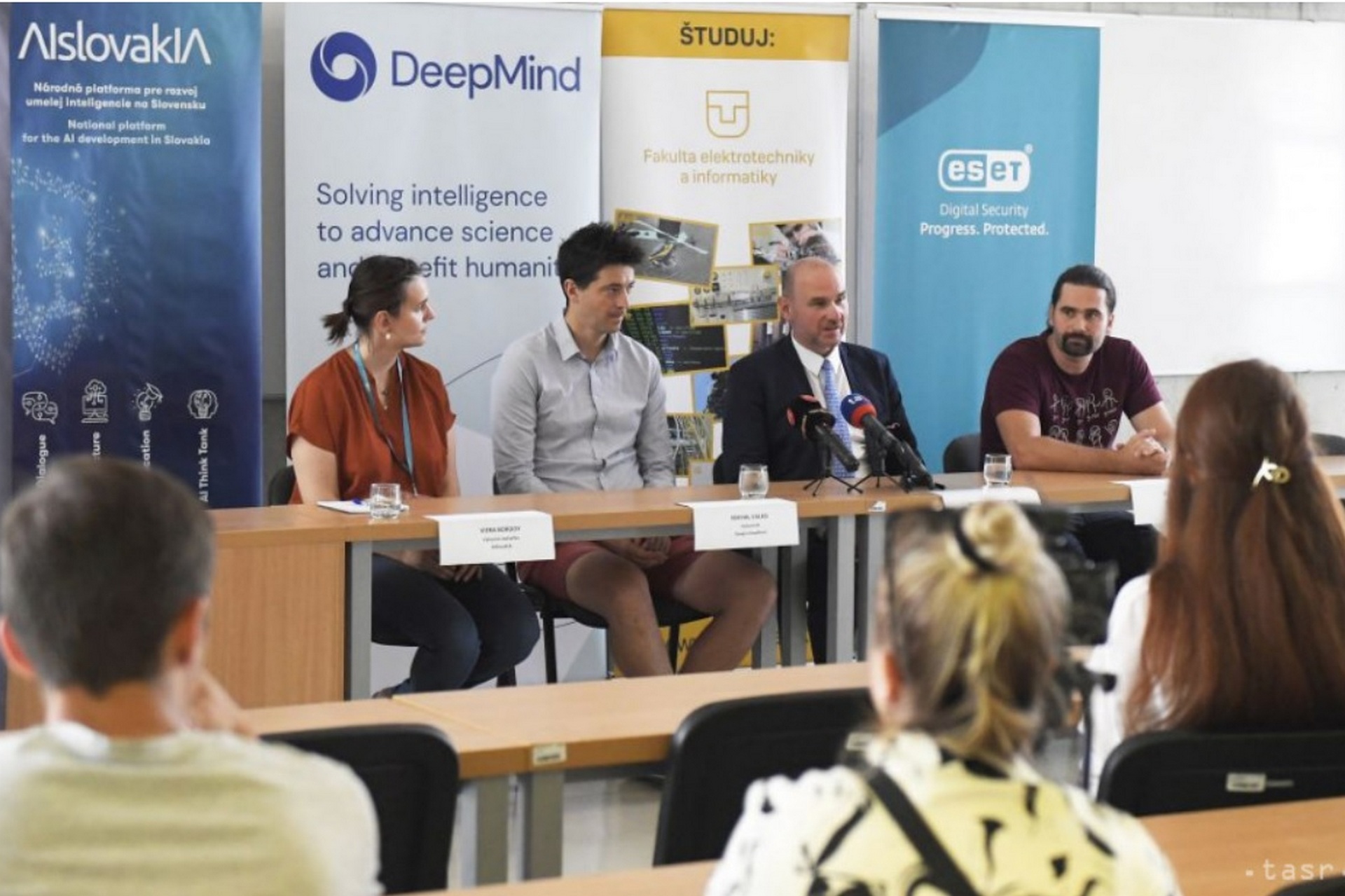 Na snímke zľava: výkonná riaditeľka AISlovakIA Viera Bordoy, výskumník Google DeepMind Michal Valko, prorektor pre vonkajšie vzťahy TU KE Jaroslav Porubän a technologický riaditeľ ESET Juraj Malcho