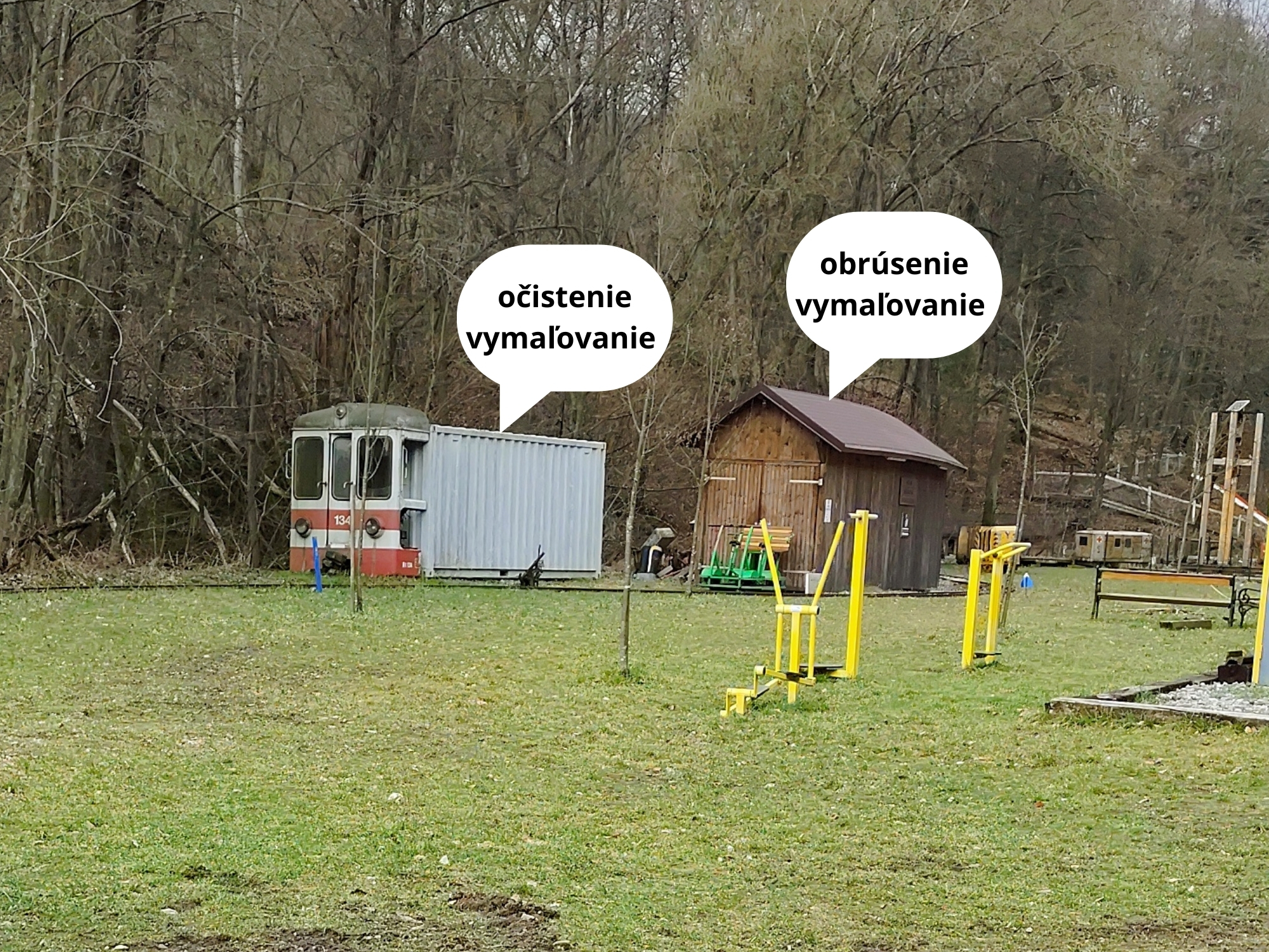 Najprv obrúsime a potom namaľujeme dva drevené kontajnery a pretrieme ďalší kontajner na zeleno.