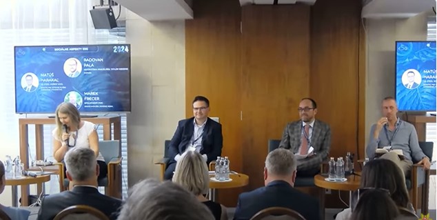 Aj spoločnosť U. S. Steel Košice, s.r.o. mala na tejto konferencii zastúpenie. Matúš Harakaľ (vľavo), riaditeľ pre účtovné služby a finančné výkazníctvo, hovoril v diskusii o sociálnych aspektoch implementácie ESG reportovania, spolu s ďalšími zástupcami súkromného sektora.