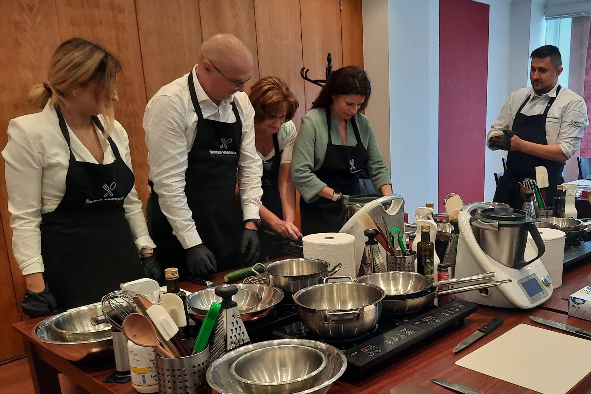 Včera vymenila štvorica našich manažérov svoje obvyklé pracovné nástroje, ktorými sú počítače či notebooky za ostro nabrúsené nože, hrnce a varešky. Prijali totiž pozvanie na pilotnú školu varenia, ktorú zorganizovala spoločnosť Delirest.