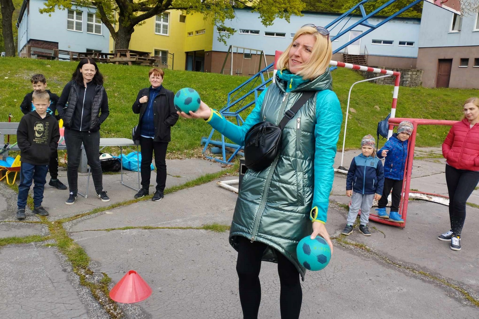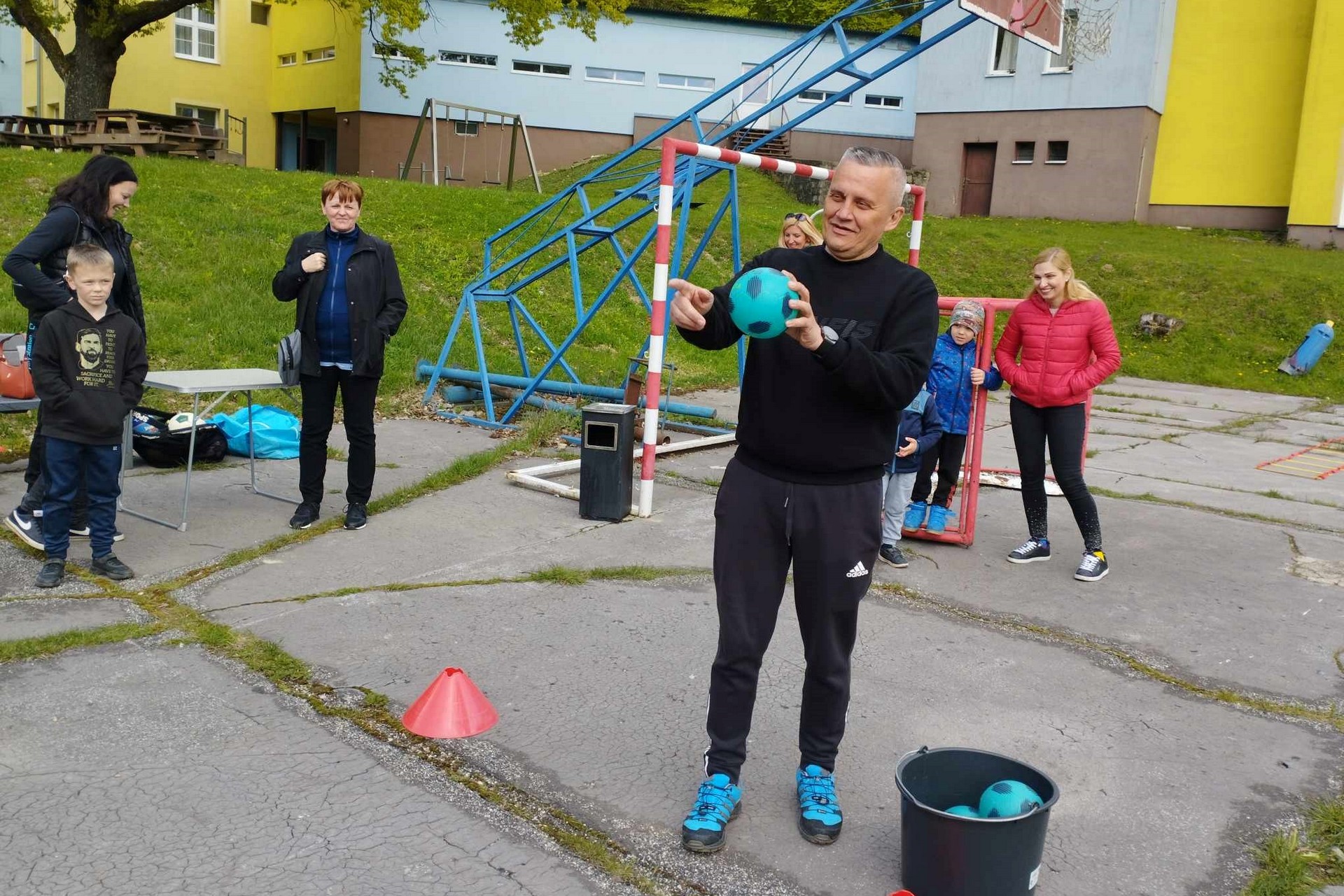 Začiatok sobotňajšieho popoludnia patril zábavným športovým disciplínam. Rodičia pobádali svoje deti, aby sa určite zapojili a predviedli, čo dokážu. Veselí boli iba do momentu, kým sme im nepovedali, že súťažiť musia úplne všetci, bez rozdielu veku. Samozrejme, súťaže a športy, ktoré sme si pre nich pripravili na majstrovstvách sveta ani na olympijských hrách nenájdete. Išlo nám o zábavu, nie o heroické výkony. Súťažili sme v hode loptou na kôš, kope na bránku, „dribling“ s basketbalovou loptou pomedzi prekážky. Na pohľad najľahšia disciplína – hod krúžkov sa napokon ukázala ako najťažšia. A tá, ktorá vyzerala najťažšie – preskackať pomedzi prekážky, na konci prehádzať loptičky z jedného vedra do druhého a vrátiť sa pomedzi prekážky naspäť, bola pre deti úplnou hračkou.