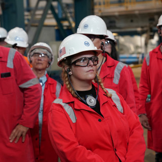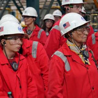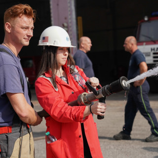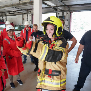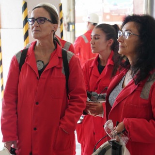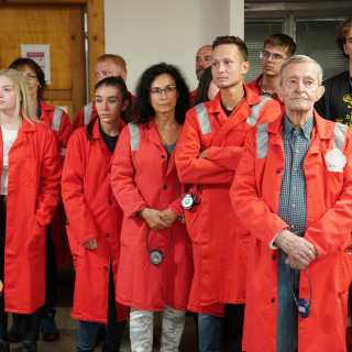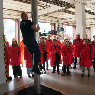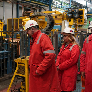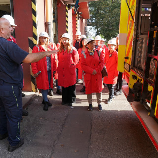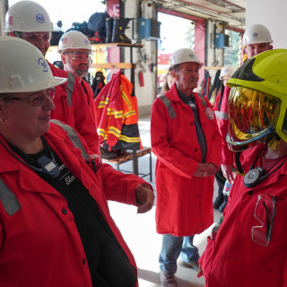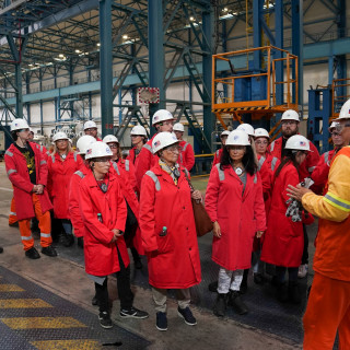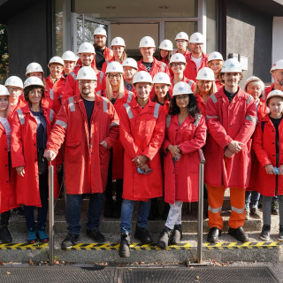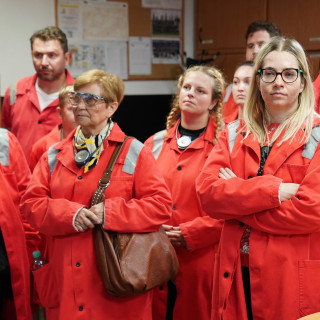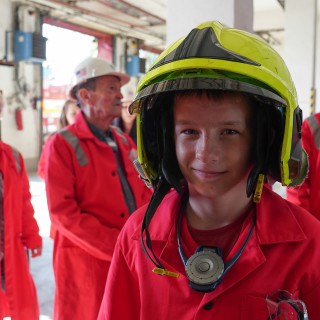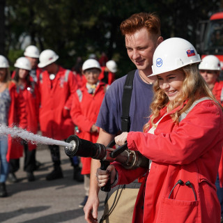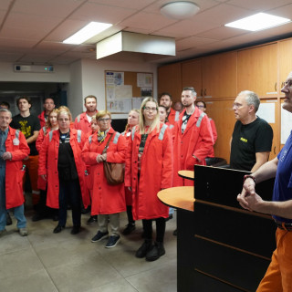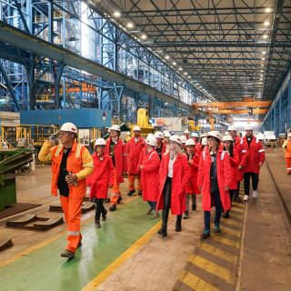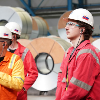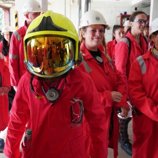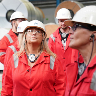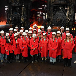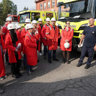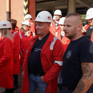 Rodinných príslušníkov víťazov 3. súťažného kola Rút Jadrnej, Martina Danka z Dopravy, Renáty Karasovej z IT, Petra Protivňáka, Jaroslavy Tučekovej z Nákupu, Gabriela Magyara zo Studenej valcovne, Ľubomíra Jašša zo Zušľachťovní a obalovej vetvy a Petra Juhásza z Údržby privítal a po prevádzkach sprevádzal Marek Lukačin, generálny manažér pre prvovýrobu a transformáciu prvovýroby spolu s Františkom Gregorom z Vonkajších vzťahov. Prehliadka začala v Centre osobných ochranných pomôcok pre návštevníkov, kde si každý z účastníkov vyfasoval prilbu, okuliare, rukavice a červený plášť. Takto vychystaní sme sa vydali minibusmi smerom k našim hasičom, no ešte predtým sme nemohli vynechať „fototermín“. Veď nie každý z nás má príležitosť vyskúšať si a sfotiť sa v pravej hutníckej prilbe.