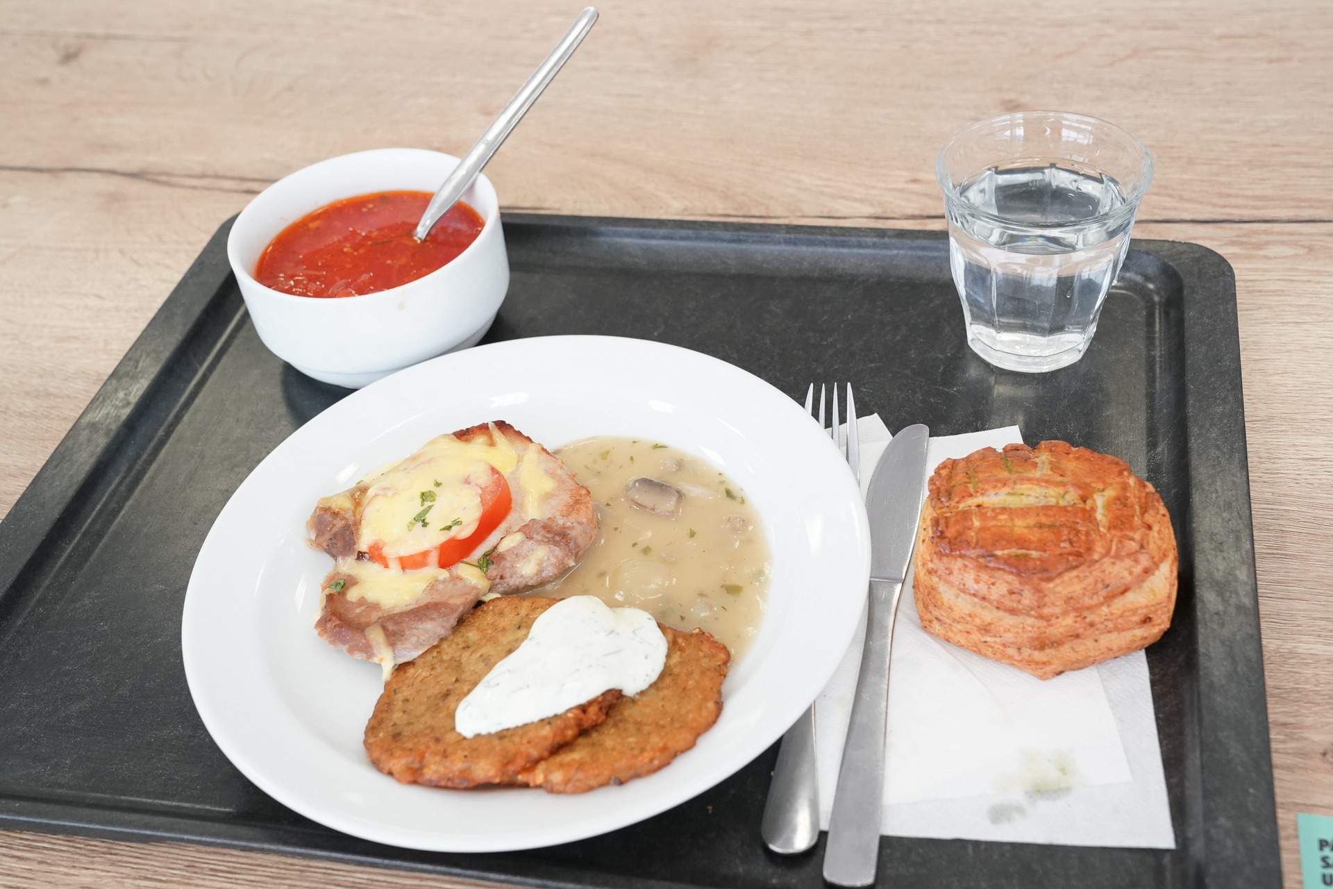 Ale zvládli to perfektne. Podávali boršč a bulky (pagáčiky), odbivnu (bravčové mäso zapečené so syrom a paradajkami) a k tomu deruni (malé, okrúhle zemiakové placky ozdobené kyslou smotanou s kôprom).