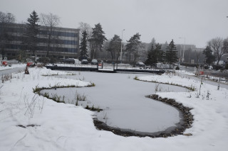 Jazierko, ktoré na nepoznanie zmenilo ráz priestoru pred hlavnou administratívnou budovou vo Vstupnom areáli U. S. Steel Košice, pokryl sneh, časť vody zamrzla.